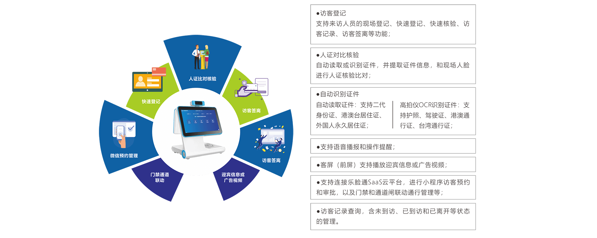 V6系列多功能智能訪客一體機(jī)可以搭載小樂(lè)智能訪客管理SaaS云平臺(tái),實(shí)現(xiàn)刷臉、刷二維碼和刷卡等快速通過(guò)閘機(jī)或門禁,實(shí)現(xiàn)人員登記、通行管理、訪客管理、考勤管理、智能門禁、身份驗(yàn)證等多個(gè)功能。