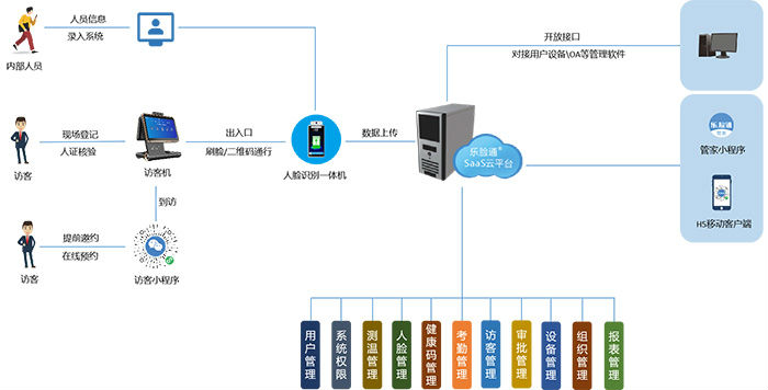 訪客管理系統(tǒng)主要由云平臺(tái),微信小程序,H5客戶端,訪客一體機(jī),人證識(shí)別終端,通道門或其他門禁等組成。