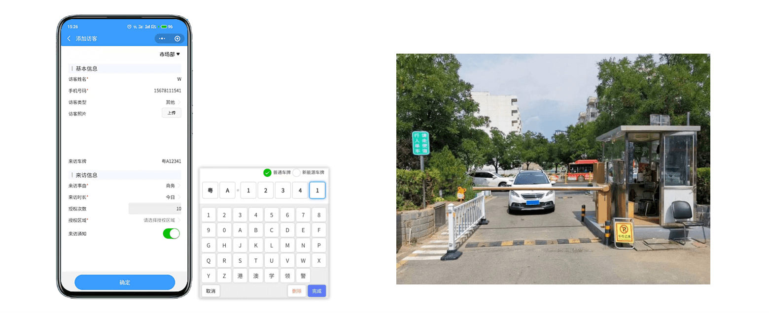系統(tǒng)支持機(jī)動(dòng)車出入口道閘對(duì)接和聯(lián)動(dòng)管理,訪客在預(yù)約時(shí)填寫車牌號(hào)碼,系統(tǒng)會(huì)將車牌號(hào)碼下發(fā)到已對(duì)接過的停車場車牌識(shí)別管理系統(tǒng),識(shí)別已登記的訪客車牌后自動(dòng)放行,將到訪消息推送給被訪人。