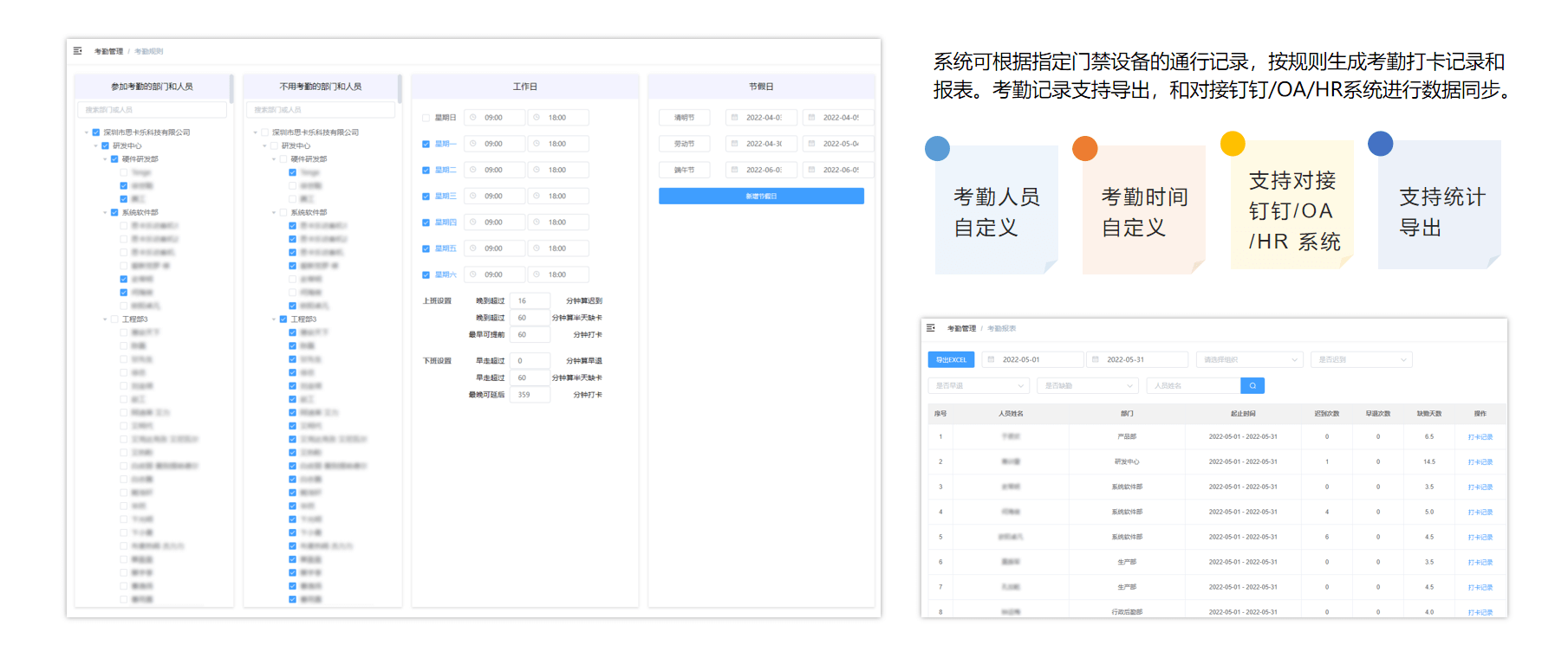 系統(tǒng)與考勤設(shè)備連接,可設(shè)置不同人員的考勤規(guī)則,節(jié)假日考勤規(guī)則等,系統(tǒng)記錄人員的考勤數(shù)據(jù),匯總?cè)?、月、年度出勤情況,可導(dǎo)出EXCEL報(bào)表方便行政人員處理。